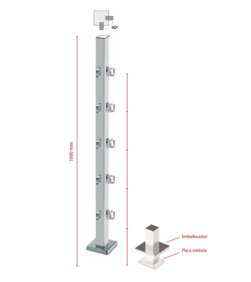 Poste Cuadrado 40 mm de Acero Inoxidable 316 Brillo y Satinado con Conectores Cuadrados a 90º