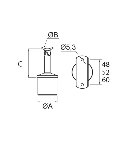 Ref.13053.47-ST: Soporte pasamanos de acero inoxidable con medidas A: 43 mm de diámetro, B: 43 mm de diámetro y C: 60 mm de longitud.
