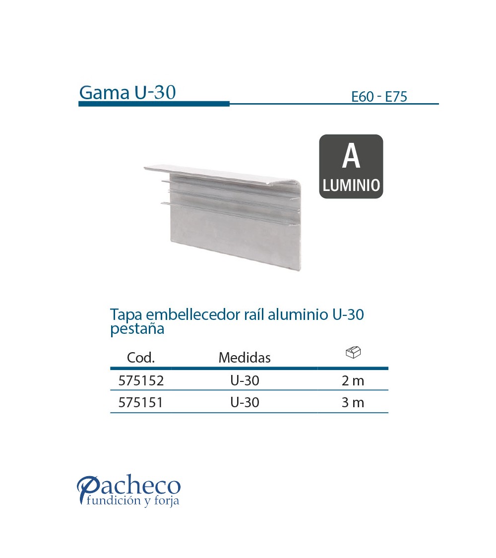 Tapa embellecedor ráil de aluminio U-30 pestaña para puerta corredera colgada